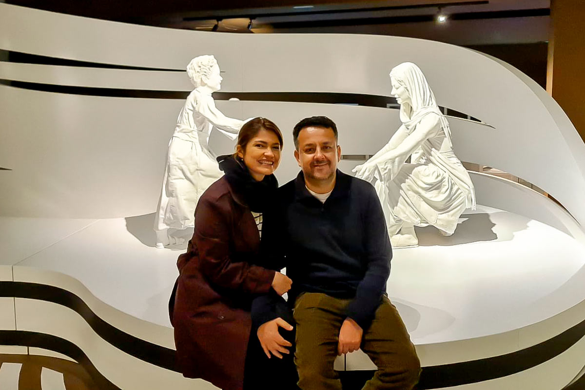 Montserrat y Javier son costarricenses y están celebrando sus bodas de plata matrimoniales con un viaje por diversos santuarios marianos en Europa. Hoy han visitado Torreciudad y han realizado un recorrido guiado que ha incluido el Espacio «Vive la experiencia de la fe» (momento que recoge la fotografía) y la proyección del vídeo-mapping «El retablo te cuenta». Durante su estancia han asistido a la misa celebrada en el altar mayor del templo, en la que se ha rezado especialmente por ellos.