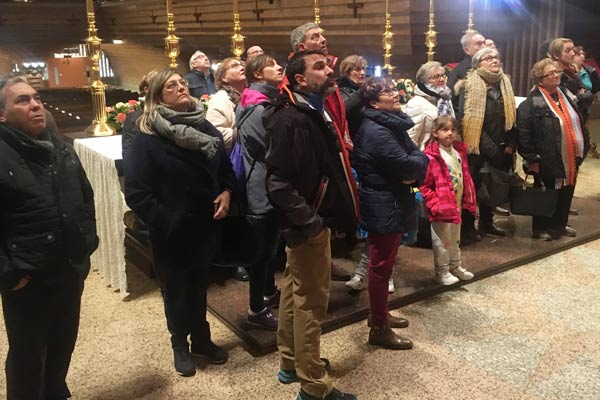 Organizada por la Asociación de Amas de Casa de la población oscense de Naval, vecinos de esta localidad cercana al santuario han participado hoy en una visita a Torreciudad acompañados por su párroco, José María García Pou. Durante el recorrido guiado, han podido disfrutar de las vistas que ofrece la terraza de la torre, situada a cincuenta metros de altura sobre la explanada. También han aprovechado para rezar a la Virgen de Torreciudad desde el presbiterio, muy cerca de la imagen, pidiendo protección para todas las familias de Naval.