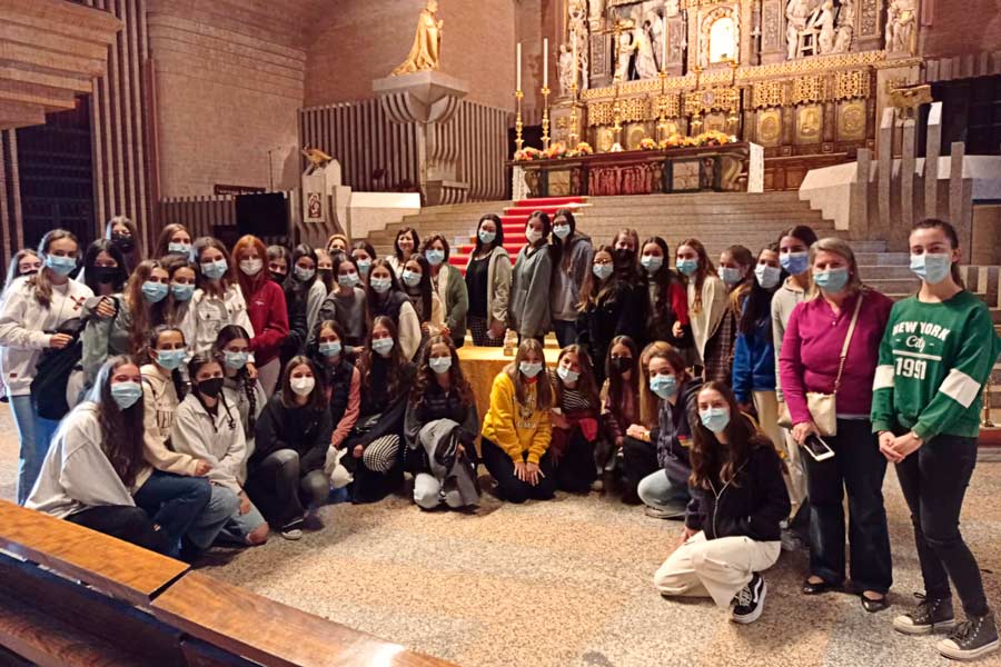 Un grupo de alumnas de 1º y 2º de Bachillerato del colegio Tierrallana-Entrepinos de Huelva ha peregrinado hoy al santuario para poner bajo la protección de la Virgen a sus familias y para traer una imagen de la Patrona del centro educativo, Nuestra Señora de Tierrallana. Tras la bienvenida en la Oficina de Turismo, han realizado una visita guiada y han participado en la Santa Misa con la Virgen de Tierrallana presidiendo el presbiterio del altar mayor. Al terminar la celebración, han asistido a la proyección del vídeo-mapping «El retablo te cuenta» y han impuesto a Nuestra Señora la beca del colegio.