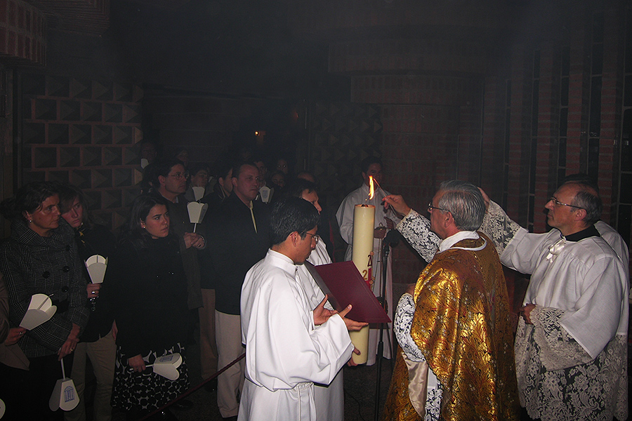 Los cientos de fieles asistentes a la Vigilia Pascual en Torreciudad se asemejaban, según una antiquísima tradición, a los criados que, con las lámparas en