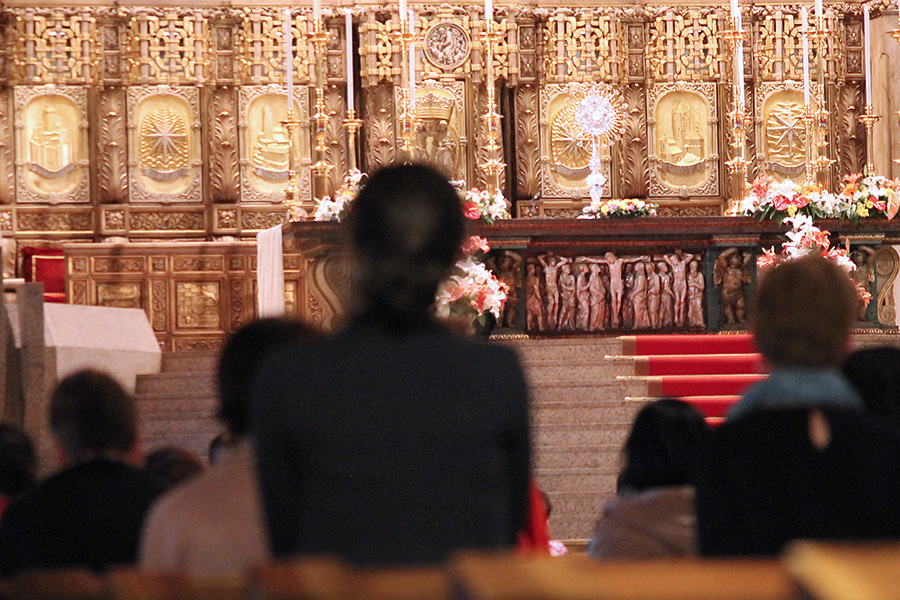 En la víspera del Corpus Christi muchas personas han adorado por turnos a Jesús Sacramentado en la capilla de Nuestra Señora de Guadalupe, de modo