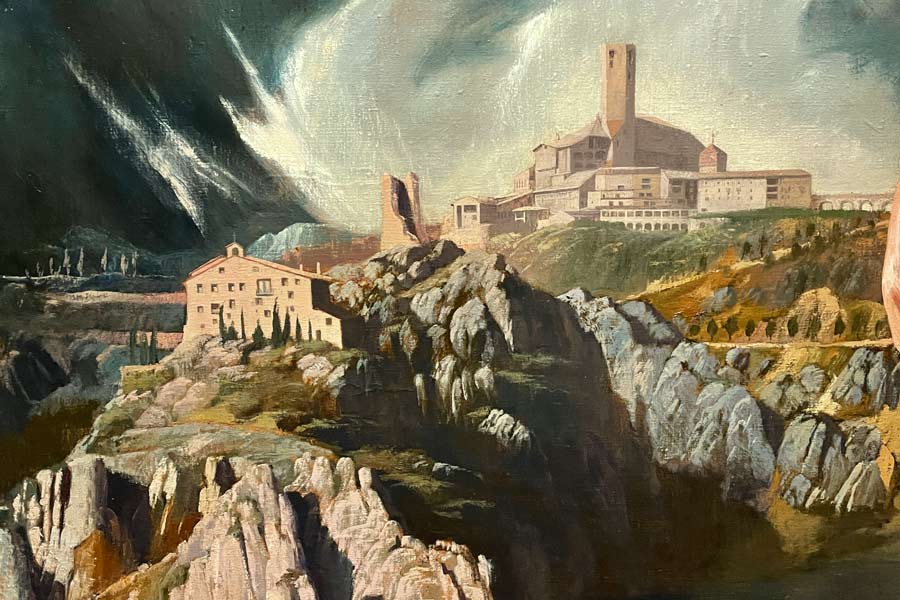 En la parte inferior del cuadro hay una vista panorámica del nuevo santuario y de la ermita. En una cartela, en la parte baja del marco, está la jaculatoria Cor Iesu Sacratissimum et Misericors, dona nobis pacem! (Corazón Sacratísimo y Misericordioso de Jesús, ¡danos la paz!), en recuerdo de la consagración del Opus Dei al Corazón Sacratísimo de Jesús, hecha el 26 de octubre de 1952, fiesta de Cristo Rey. En las paredes de la capilla, en las rejas de los balcones que asoman por la parte alta, se puede leer la jaculatoria ¡Alma, calma!, un recordatorio espiritual para poner la confianza en Dios ante las inquietudes y problemas de la vida.