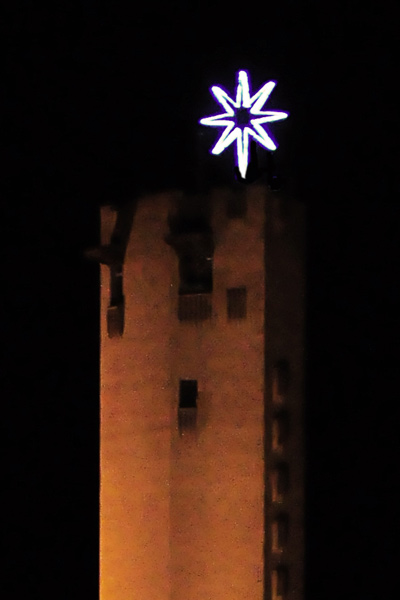 Destaca especialmente la gran estrella de 6 metros de diámetro y ocho puntas colocada en el lugar más alto, encima de la torre, que puede verse iluminada desde el atardecer desde varios kilómetros a la redonda. Toda la iluminación emplea luces LED de elevada calificación medioambiental y ha sido fabricada e instalada por proveedores locales de Huesca (estructura) y Graus (iluminación).