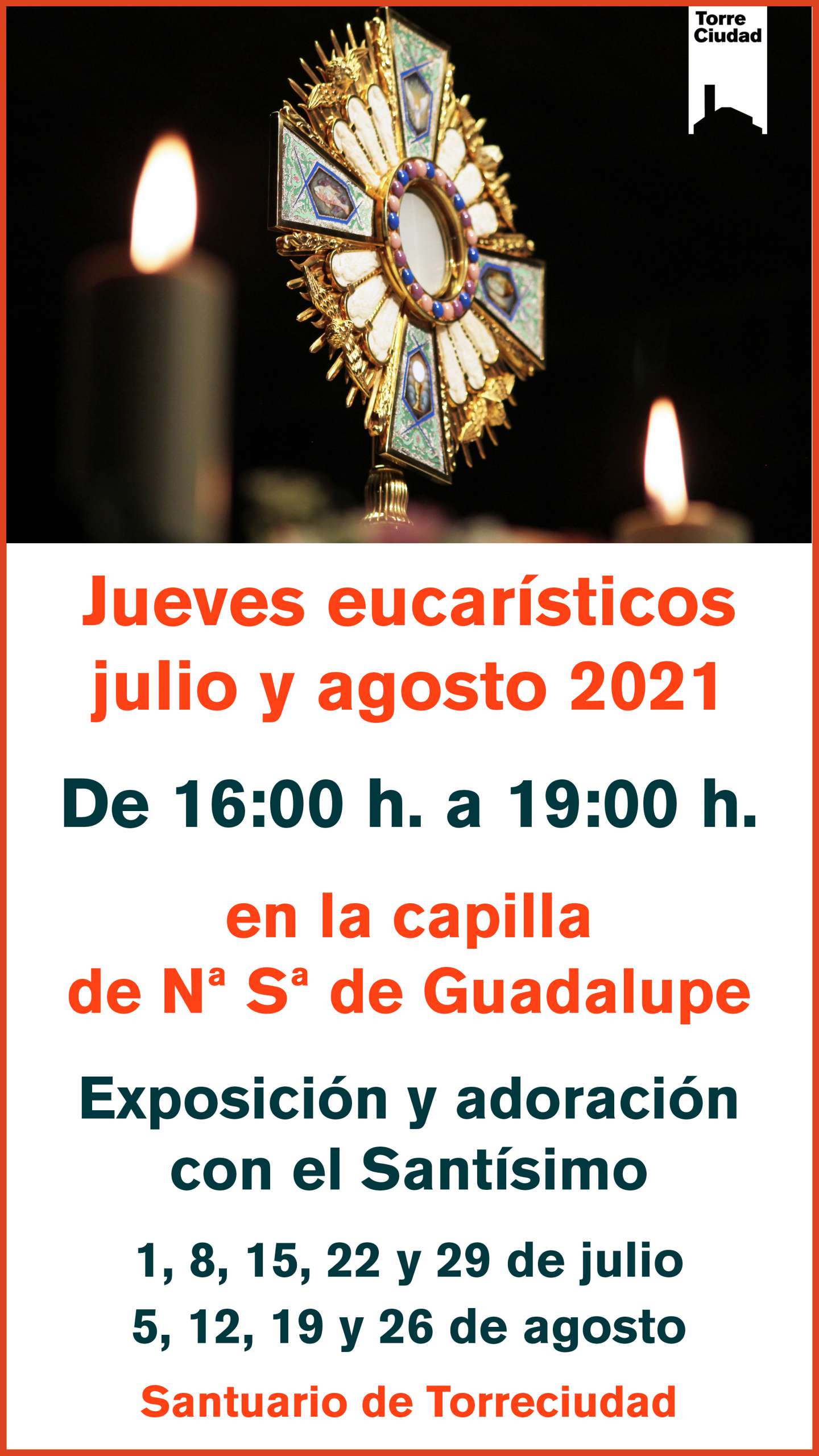Durante los meses de julio y agosto, los jueves en Torreciudad tendrán un carácter especialmente eucarístico. Tendremos Exposición y adoración con el Santísimo de 16:00 a 19:00 h. en la capilla de Nuestra Señora de Guadalupe. Se retransmitirá por nuestro canal de Youtube de 16:00 a 18:00 (momento en que retransmitiremos la Santa Misa) y desde que termine la Santa Misa hasta las 19:00. Clicando en la imagen inferior se puede descargar el cartel informativo para difundir por WhatsApp y en redes sociales.