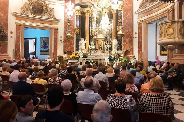 La Basílica de los Desamparados de Valencia ha acogido esta tarde la imagen peregrina de la Virgen de Torreciudad, en el recorrido que está realizando por tierras levantinas y Mallorca durante el mes de octubre. El motivo es la devolución de la visita que tantas advocaciones marianas de estos lugares han hecho al santuario de Torreciudad durante las últimas décadas. Los actos han comenzado con su entrada por la puerta más cercana al presbiterio de la iglesia, llevada en andas adornadas con vistosas flores y acompañada por una cariñosa salva de aplausos de los fieles que llenaban la nave. Enseguida se ha rezado el Rosario y se ha cantado la Salve, y el vicerrector de la Basílica, don Álvaro Almenar, ha saludado a los presentes y ha narrado el desarrollo de la devoción a la Mare de Déu dels Desamparats.