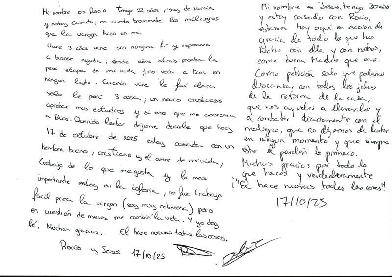 • Mi nombre es Jesús, tengo 30 años y estoy casado con Rocío, estamos hoy aquí en acción de gracias por todo lo que has hecho con ella y con nosotros, como buena Madre que eres. Como petición solo que podamos descansar con todos los jaleos de la reforma de la casa, que nos ayudes a llevarlos y a combatir diariamente con el maligno, que no dejemos de luchar en ningún momento y que siempre esté el perdón lo primero. Muchas gracias por todo lo que haces, y verdaderamente, «¡Él hace nuevas todas las cosas!».