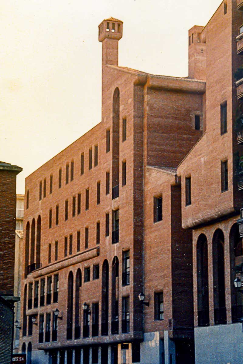 Cuando me encargaron un salón de actos en la parte posterior de la iglesia de Santa Engracia, aunque era un nuevo edificio adosado, traté de alguna forma reflejar su unión con ella. Continué las mismas hiladas de ladrillo marcadas en las esquinas traseras de la iglesia continuándolas, y como el programa de lo que me exigían me dejaba en la parte superior la fachada lisa y ciega del resto de la pared posterior de la iglesia, traté de embellecerla proyectando un cimborrio como tenían muchas iglesias antiguas. Pero este cimborrio no tenía razón de ser porque no albergaba ninguna funcionalidad, y por eso salió diáfano al aire libre, queriendo enriquecer esa fachada posterior con intención de no ocultarla sino de completarla, pretendiendo embellecerla, aunque sentí no conseguir un ladrillo de la misma textura y color porque hubiera encarecido enormemente el presupuesto.