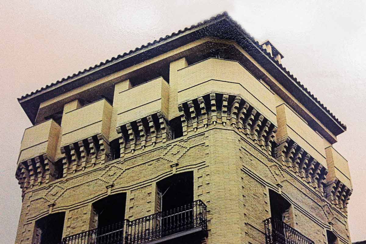 La fachada que daba al Ebro era la continuación del Palacio Arzobispal, que tenía una torre en el extremo más alejado. Parecía como si reclamara otra torre similar en el lado opuesto que lo rematara y dejara clara su separación con los edificios de viviendas que se iban a construir junto a él. Esa torre no es del Palacio, aunque por su simetría parezca que forma parte de él: es de las viviendas, pero sirve como gozne o charnela que, separando, une toda la fachada.