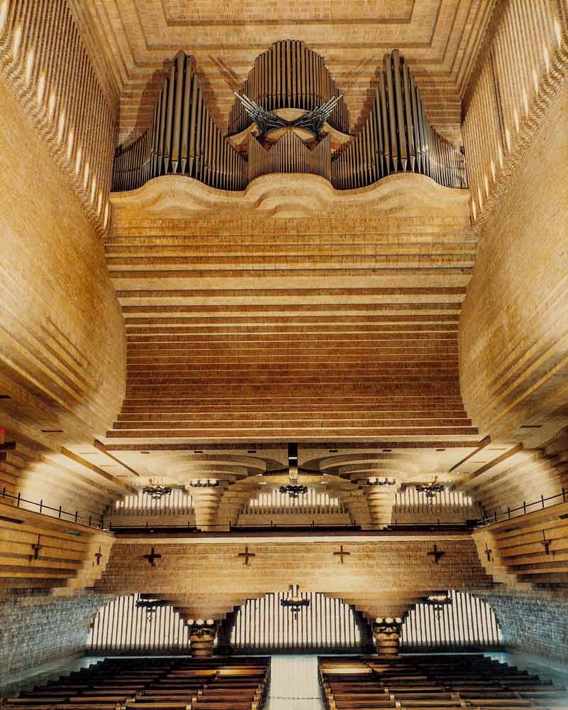 Pero aún quedaba por solucionar la iglesia, porque al diseñarla y hacerla amplia yo me negaba a proyectarla como tradicionalmente se construían las grandes iglesias o catedrales, con tres naves separadas por columnas. Las columnas quitan mucha visibilidad hacia el presbiterio y acababan transformándose en tres capillas cada una con su retablo. Estando en pleno siglo XX, y como la propiedad me había pedido que hiciera unas galerías superiores para ampliar su capacidad, decidí proyectarlas sobre grandes voladizos de hormigón. Como es natural, la iglesia iba a ser de hormigón visto, pero esto a la propiedad no le gustó. Me habían insistido en que no querían una iglesia original, que llamara la atención por su singularidad rompiendo con toda la tradición, y me pidieron que recubriera el hormigón.