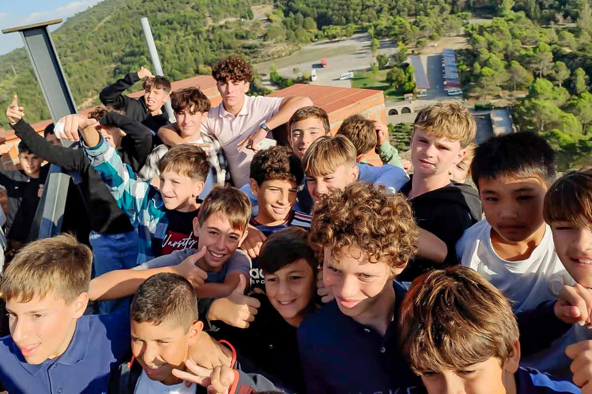 Alumnos de 1º de ESO de la Escola Camp Joliu de L’Arboç, en Tarragona, han visitado hoy Torreciudad en el marco de una convivencia organizada por el centro educativo en las inmediaciones del santuario. Tras la bienvenida ofrecida al grupo en la Oficina de Turismo, por grupos han rezado el rosario y han realizado un recorrido guiado que ha incluido la subida al campanario de la torre (momento que recoge la fotografía). Durante su estancia han asistido a la misa celebrada por su sacerdote en el altar mayor del templo y a la proyección del vídeo-mapping «El retablo te cuenta».
