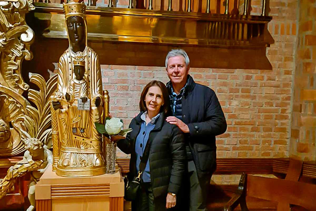 Angelines y Santiago están realizando una peregrinación por varios santuarios marianos en Europa. Hoy han estado en Torreciudad y han seguido un recorrido guiado que ha incluido el Espacio «Vive la experiencia de la fe», el vídeo-mapping «El retablo te cuenta». Durante su estancia han asistido a la misa celebrada en el altar mayor del templo y han rezado ante la imagen románica de Nuestra Señora de Torreciudad.