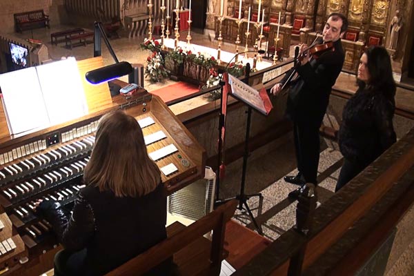 El violinista César Salinas, la soprano Ruth Repáraz y la organista titular de Torreciudad, Maite Aranzabal, han ofrecido hoy un recital de villancicos que ha resultado muy del agrado del público asistente. Esta era la segunda actuación incluida en la programación musical organizada para estas fiestas navideñas. La Coral Barbitanya de Barbastro protagonizó la primera en el Concierto de Navidad celebrado el pasado sábado en la iglesia del santuario.
