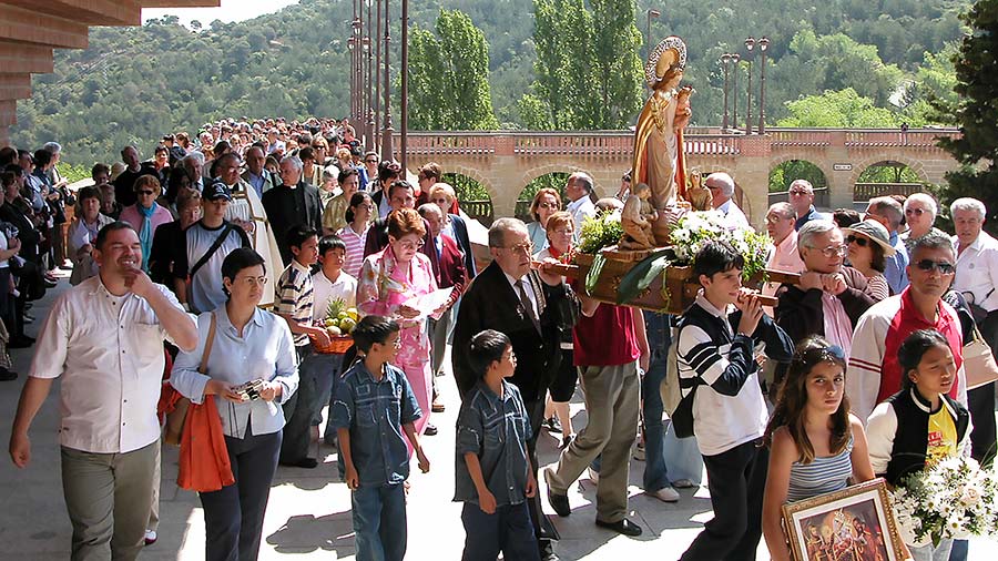 La parroquia de Montalegre de Barcelona vino en romería a Torreciudad, el 30 de mayo de 2004, para ofrecer una réplica de la imagen de su patrona, que presidió la Misa y el Rosario desde el Crucero.