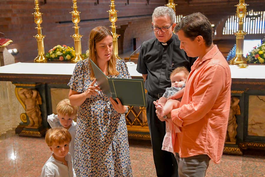Teresa y Juan viven en Madrid, y hoy han visitado el santuario con sus tres hijos, Pablo, Tomás y la pequeña Marta, a los que han ofrecido a la Virgen de Torreciudad en compañía también de sus abuelos. En este sencillo acto familiar les ha acompañado el vicerector de Torreciudad, Pedro García de Jalón.