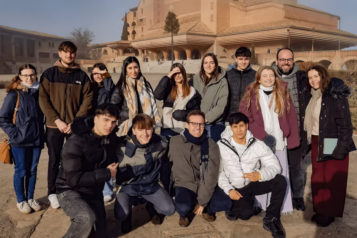 Este grupo de jóvenes universitarios de la parroquia madrileña de María, Madre del Amor Hermoso, acompañados por su párroco, están recorriendo algunos santuarios de la Ruta Mariana y hoy han visitado Torreciudad por primera vez. Tras la bienvenida ofrecida en la Oficina de Turismo, han visto el vídeo de presentación del santuario, han realizado un recorrido guiado que ha incluido el Espacio «Vive la experiencia de la fe» y han asistido a la misa celebrada en el altar mayor del templo y a la proyección del vídeo-mapping «El retablo te cuenta».