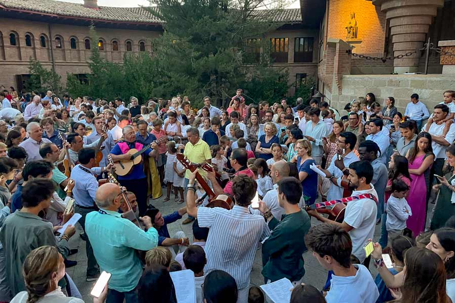 El lado del altar al aire libre de la explanada hay una imagen de la Virgen de Torreciudad, y ahí se reunieron todos a las 21:00 h. para cantar canciones de amor humano que fácilmente se convierten en «coplas de amor a lo divino», tal y como le gustaba definirlas a san Josemaría Escrivá. Él inspiró a muchas personas este modo de rezar, aprovechando la música y las letras, porque pueden expresar muy bien el amor al Señor y a su Madre.