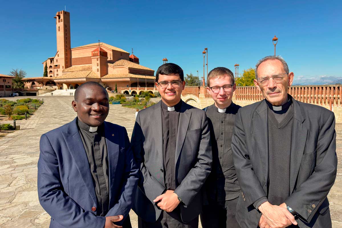 Estos cuatro amigos, sacerdotes originarios de Malawi, Brasil, Polonia y España, han venido hoy a Torreciudad para pasar el día junto a la Virgen y rezar el rosario unidos a las intenciones por la paz propuestas por el Papa León XIV en este mes de octubre. Han celebrado misa en la capilla de la Sagrada Familia y han almorzado al aire libre bajo los soportales de la explanada.
